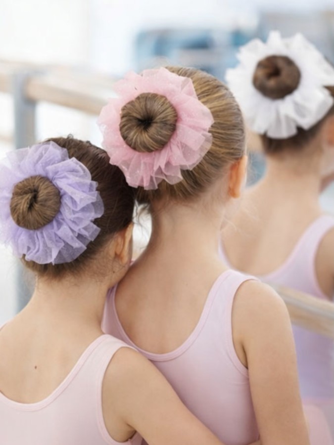 Ozdobna gumka do włosów Serenity, wykonana z tiulu dekorowanego brokatem to uroczy dodatek do stylizacji podczas pierwszych lekcji tańca klasycznego.