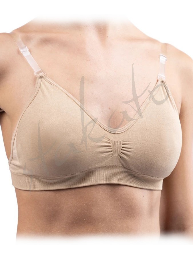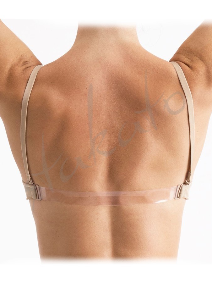 Top w naturalnym kolorze z usztywnionymi miseczkami, przezroczystym paskiem na plecach i dwoma kompletami ramiączek - cielistymi i transparentnymi.