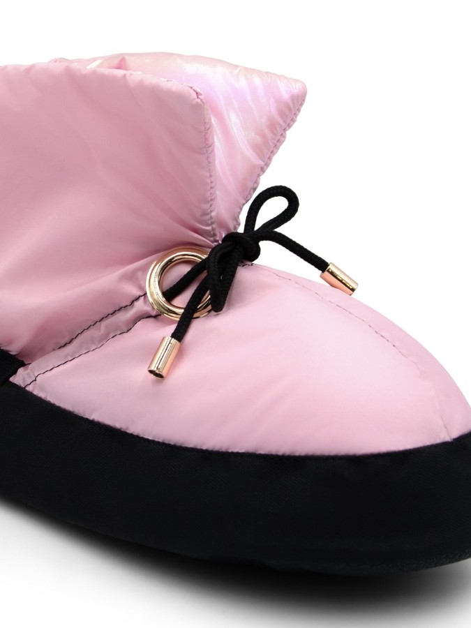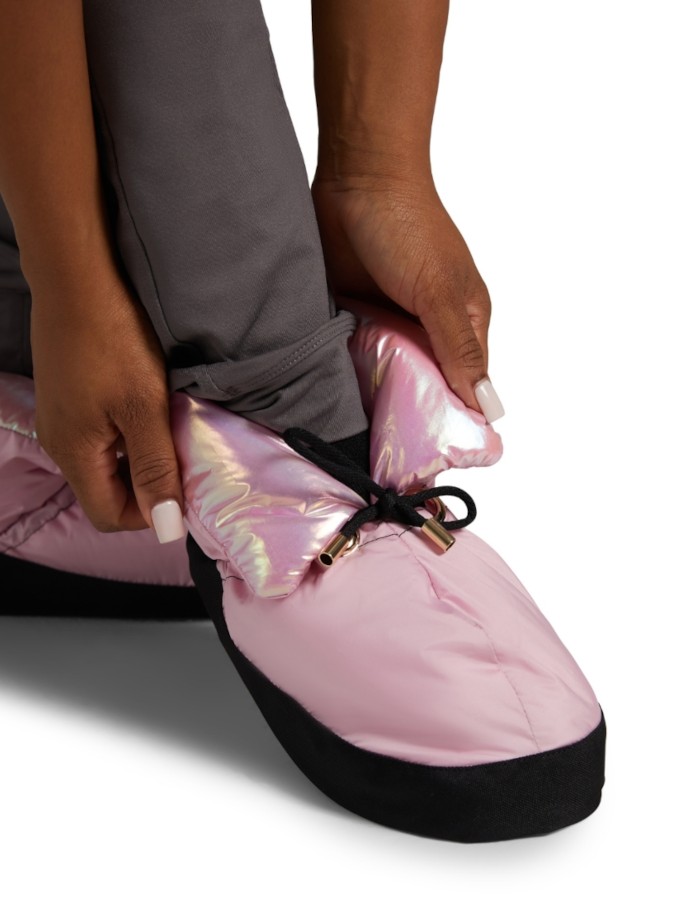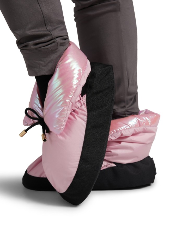 Buty ocieplające, zaprojektowane z myślą o utrzymaniu ciepła stóp przed zajęciami tanecznymi, próbami oraz podczas przerw między wejściami na salę. Model w pastelowym, różowym kolorze został wzbogacony o połyskującą, metaliczną podszewkę, która nadaje mu nowoczesny i sceniczny charakter.