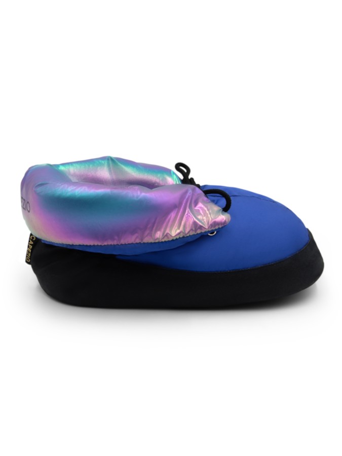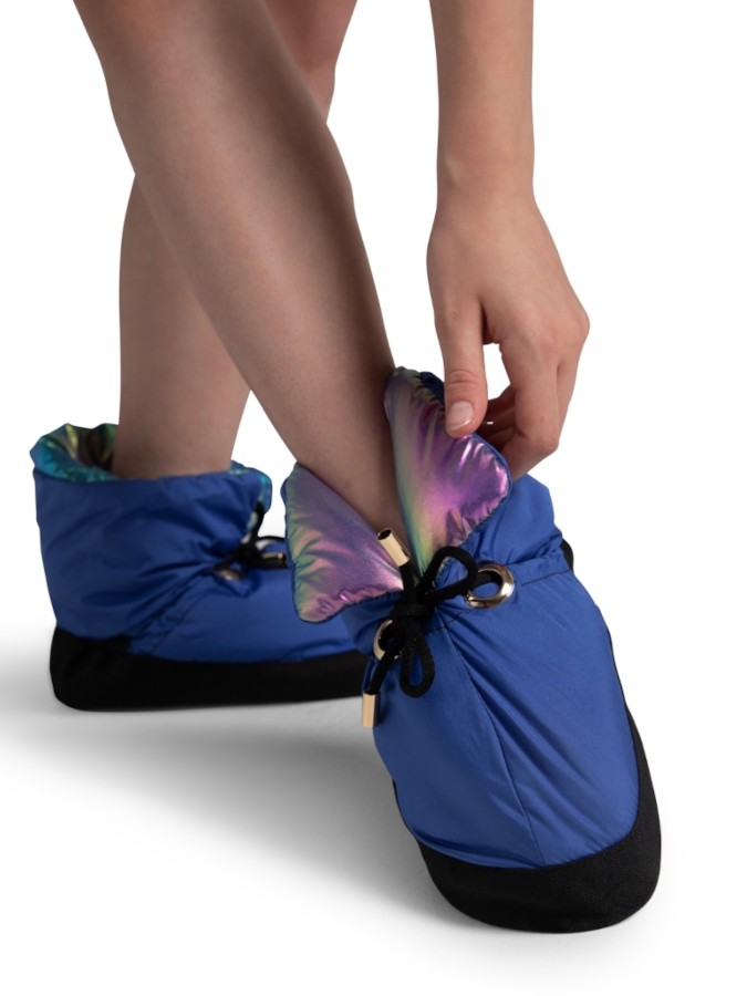Buty ocieplające Mini Glam WarmUp Bootie to połączenie funkcjonalności i estetyki. Zaprojektowane tak, aby skutecznie utrzymywać ciepło stóp podczas rozgrzewki, prób oraz odpoczynku między treningami. Intensywnie niebieski odcień cholewki w połączeniu z metalicznym połyskiem wnętrza przyciąga uwagę i podkreśla sceniczne ambicje.