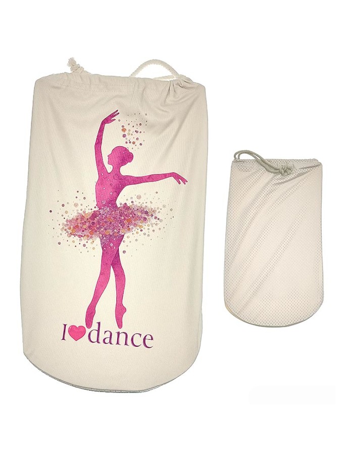 Praktyczny woreczek na pointy i baletki z efektowną, błyszczącą grafiką w impresjonistycznym stylu - I LOVE DANCE Impression to sympatyczny upominek dla tancerki w każdym wieku.
