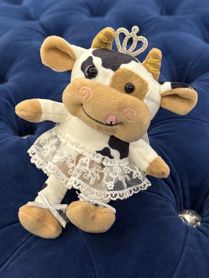 Uroczy brelok przedstawiający pluszową krówkę ubraną w strój baletnicy, ozdobioną błyszczącym diademem. Maskotka została wykonana z miękkiego materiału w czarno-białe oraz brązowe łaty, a jej stylizację dopełnia tiulowa spódniczka z haftem.