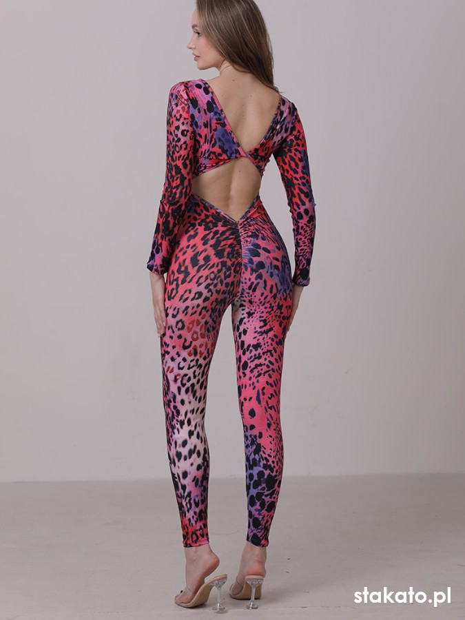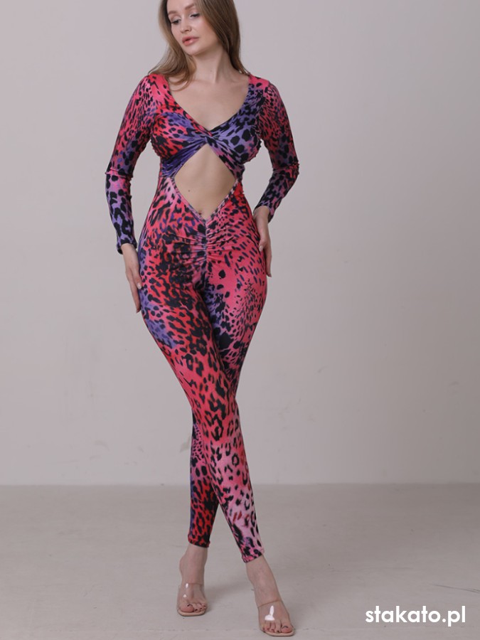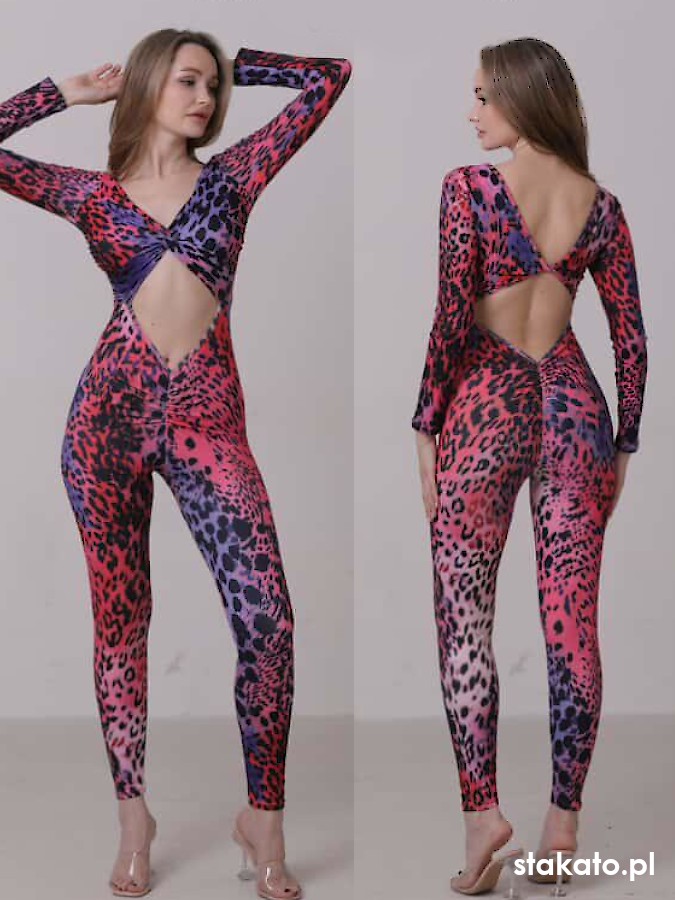 Kombinezon uszyty z elastycznej, matowej mikrofibry ozdobionej zwierzęcym wzorem. Tkanina doskonale dopasowuje się do ciała, delikatnie modelując sylwetkę, a jednocześnie nie krępuje ruchów, co jest niezwykle istotne podczas tańca.