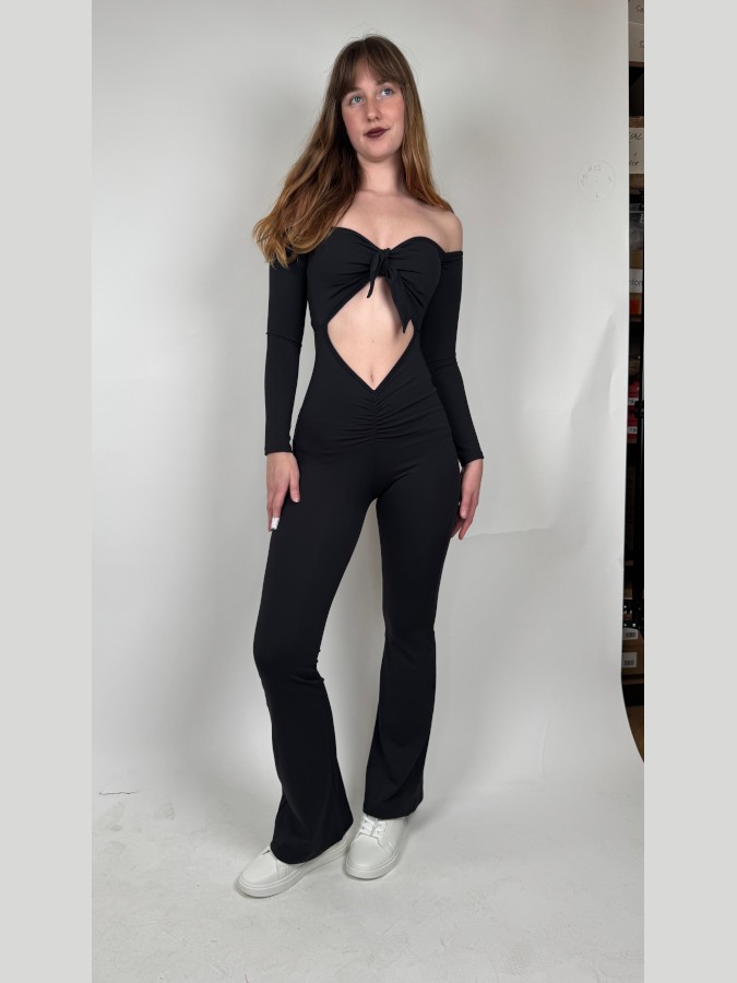 Kombinezon wykonany został z matowej, elastycznej mikrofibry, która świetnie dopasowuje się do ciała, podkreślając przy tym sylwetkę.