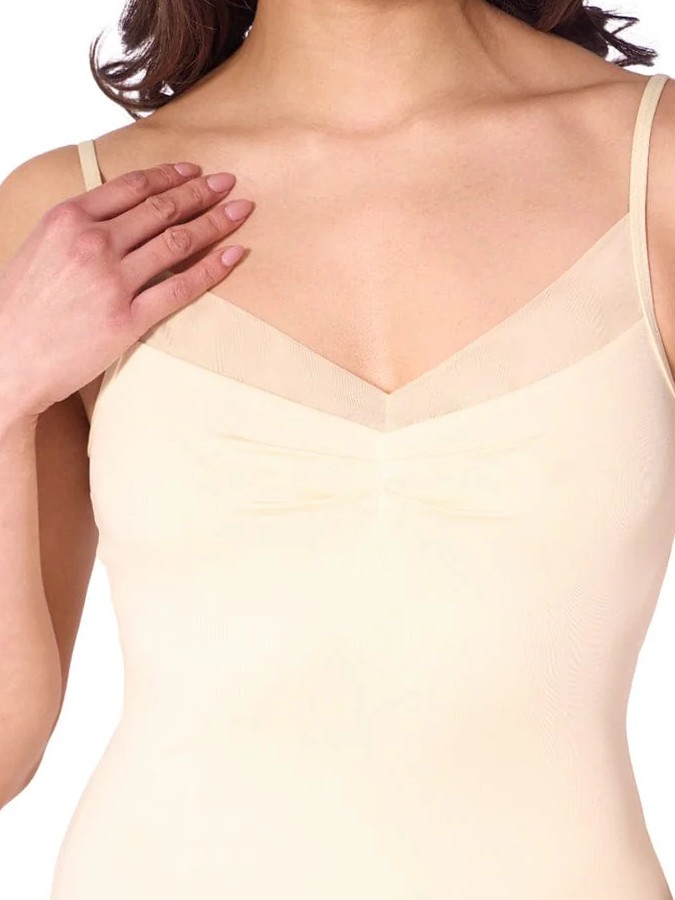 Eleganckie body na ramiączkach z marszczonym dekoltem V i delikatnymi wstawkami z siateczki, które nadają mu nowoczesnego, ale bardzo kobiecego charakteru.