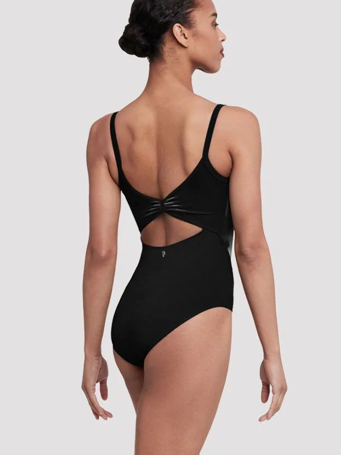 Kostium baletowy na cienkich ramiączkach. Wykonany z połączenia aksamitnego weluru i gładkiego, elastycznego materiału. Tył urozmaica ozdobne skrzyżowanie typu "twist back" i delikatne wycięcie.