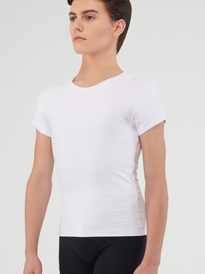 Męska koszulka taneczna typu T-shirt w kolorze białym lub czarnym z niewielkim dekoltem. Komfortowy materiał świetnie dopasowuje się do ciała. Prosty krój pozostawia pełną swobodę ruchu.