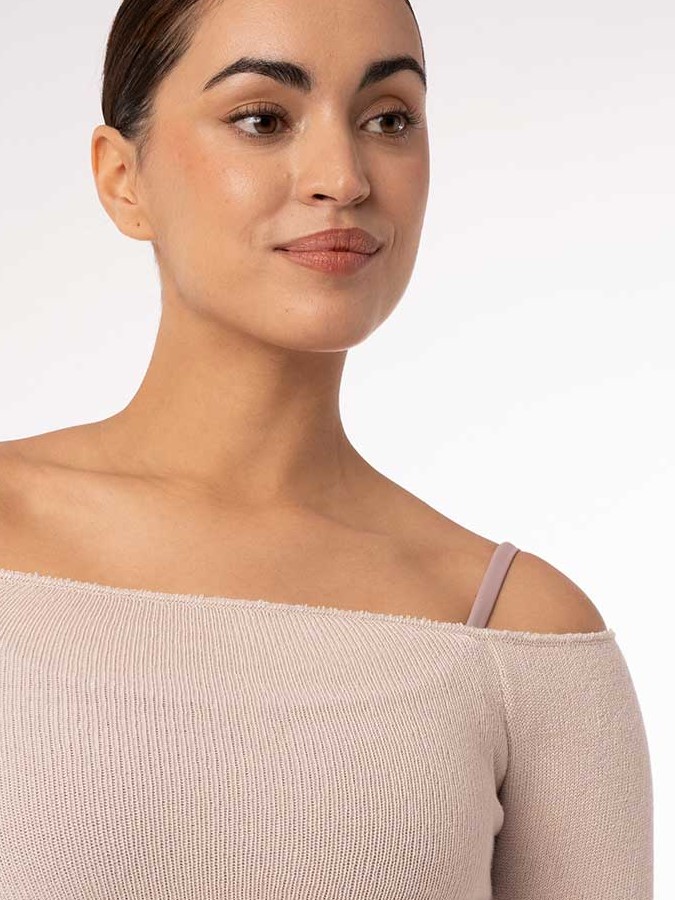 Krótki krój, obniżona linia ramion oraz rękawek 3/4 sprawiają, że sweterek Donatella wygląda modnie i stylowo, natomiast subtelne ściągacze umieszczone na krawędziach topu dodatkowo dopasowują go ciała.