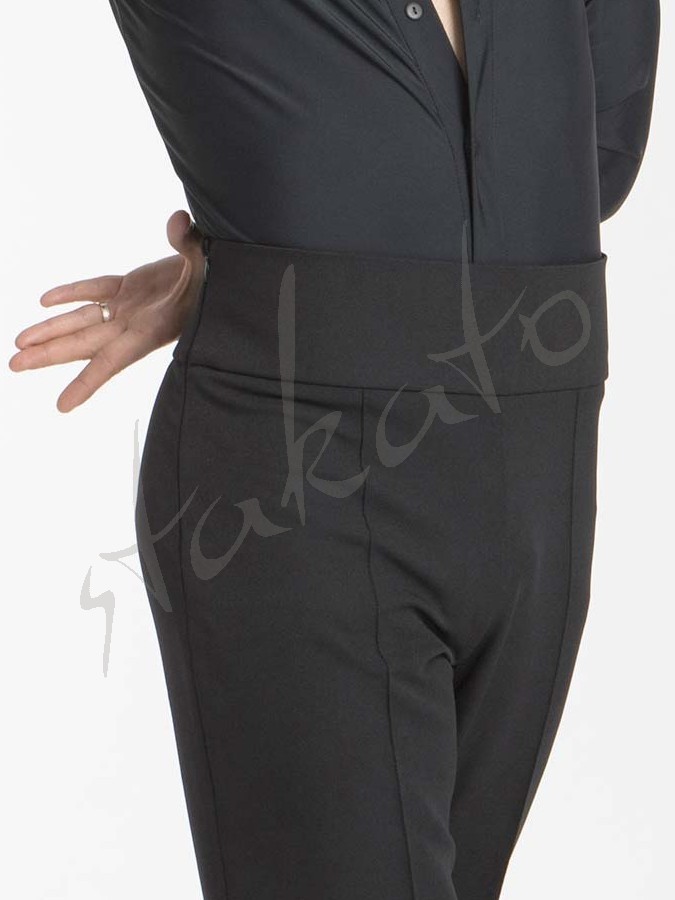 Spodnie do tańców latynoamerykańskich Pancamil mają podwyższony stan z lekko usztywnianym pasem, z boku posiadają dyskretny, ukryty zamek błyskawiczny.