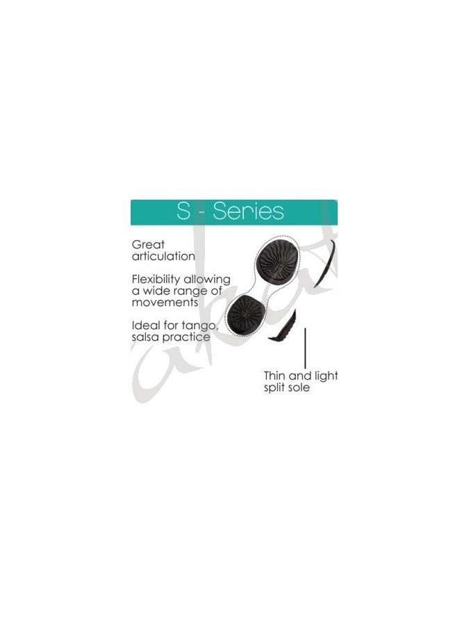- dwuczęściowa podeszwa typu S-SOLE gwarantuje przyczepność, ułatwia zginanie stopy i stawanie na palcach, dając tancerzowi dużą swobodę na parkiecie. Obniżona pięta zapewnia maksymalną elastyczność ruchu, zwłaszcza przy obciąganiu stóp,