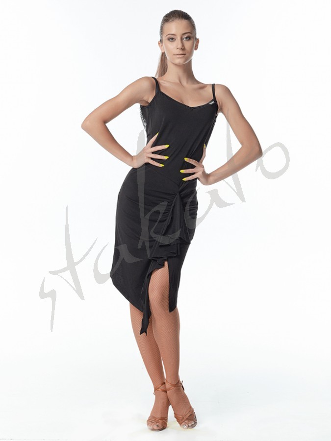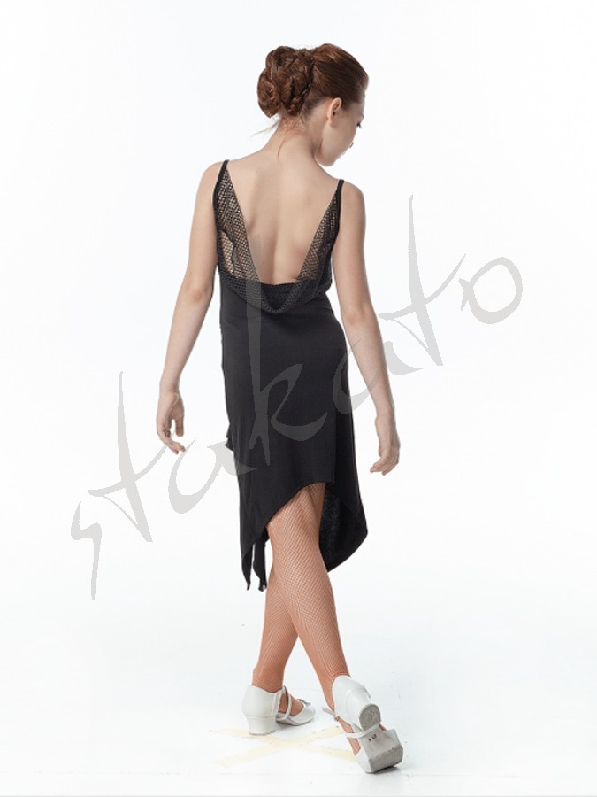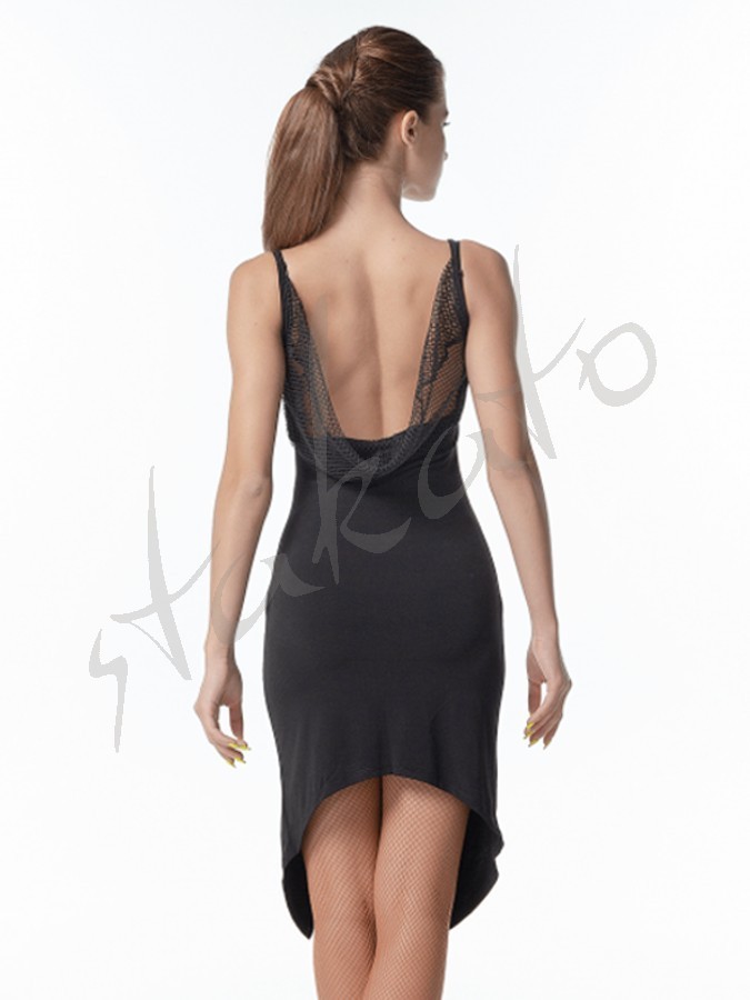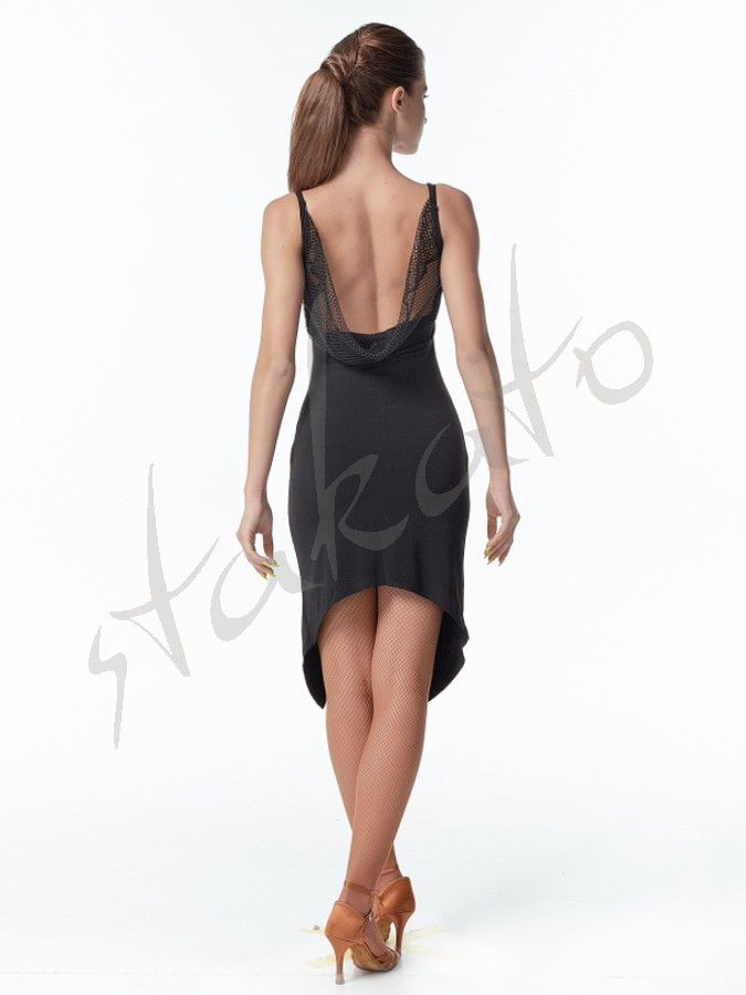 Sukienka latino z drapowaną spódniczką oraz ozdobną siateczką na plecach.