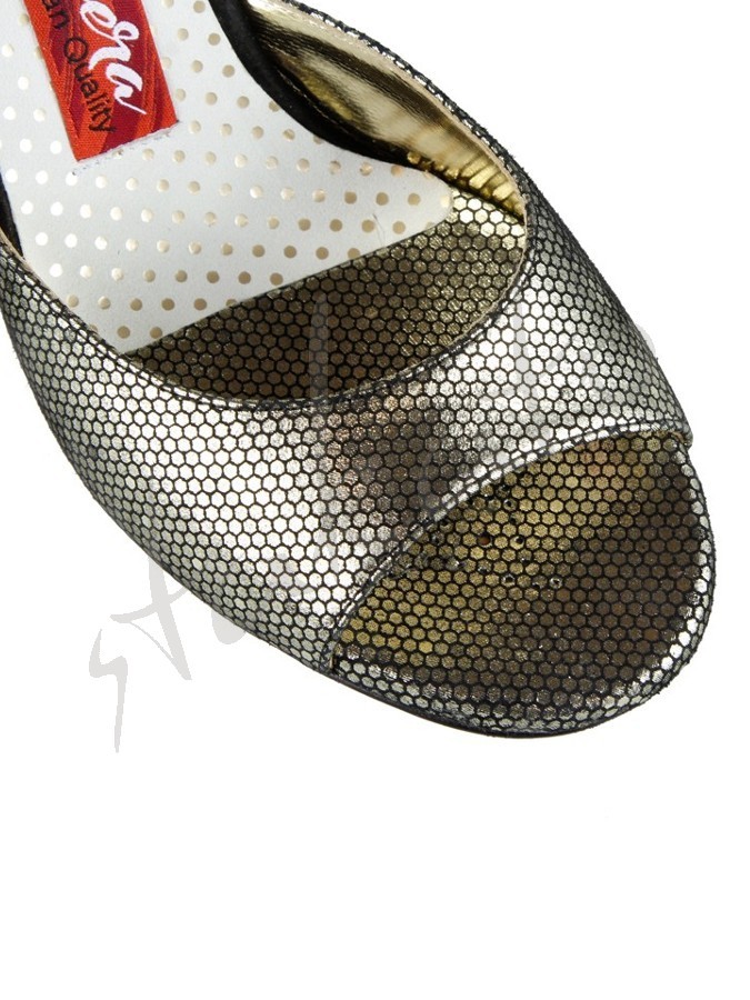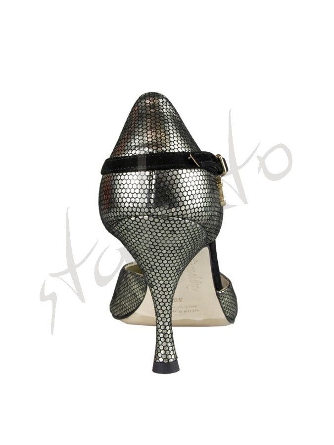 Model wykonany z czarnej skóry ozdobionej metaliczną folią w drobny wzór plastra miodu, z krótkim paseczkiem do zapięcia i piętą z czarnego weluru oraz miękką wkładką pod śródstopiem.