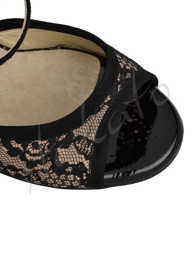 Obuwie marki Tangolera z krótkim paskiem, komfortową przyszwą i czarną koronkową dekoracją na cielistym tle. Wyjątkowy design tego modelu sprawia, że obuwie wygląda lekko, ażurowo, jakby bosa stopa była tylko ozdobiona koronką.