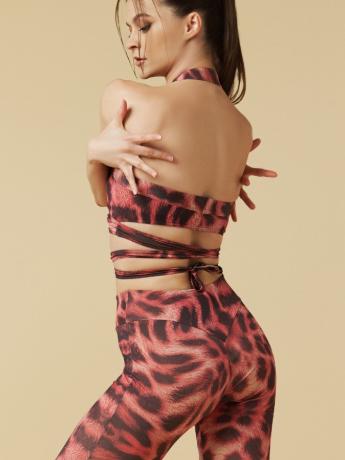 Top taneczny, wiązany, ze wzorem w panterkę. Kopertowy fason z dekoltem w kształcie litery V z przodu i elegancko przeplatanymi szerokimi ramiączkami przy szyi i plecach. Szeroki pasek u dołu doskonale dopasowuje górę do sylwetki. Bluzka stanowi idealne uzupełnienie tanecznego looku do salsy, bachaty i innych rodzajów tańców latynoamerykańskich.