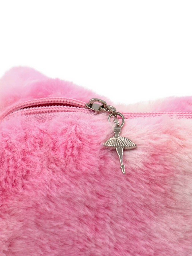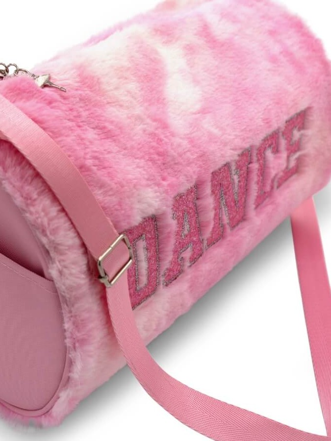 Torba w kształcie walca z miękkim futerkiem w odcieniach różu oraz ozdobnym, brokatowym napisem "DANCE" na przodzie. Tanecznym dodatkiem jest również zawieszka z baletnicą przy zamku błyskawicznym.