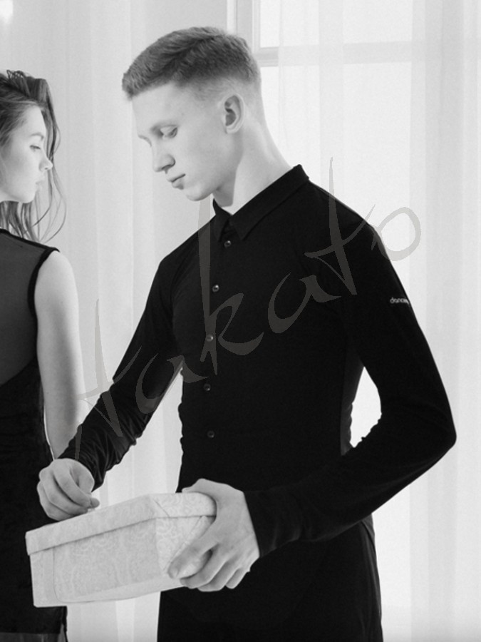 Koszula męska wykonana z elastycznej dzianiny, zapinana na guziki. Przewiewna tkanina zapewnia odpowiednią cyrkulację powietrza podczas intensywnego treningu oraz zapewnia swobodę ruchów. Koszula sprawdzi się również na próbach parkietu, roztańczeniach.